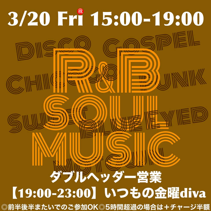★3/20(祝金)★ ダブルヘッダー営業 【15:00〜19:00】R&B Soul Music特集