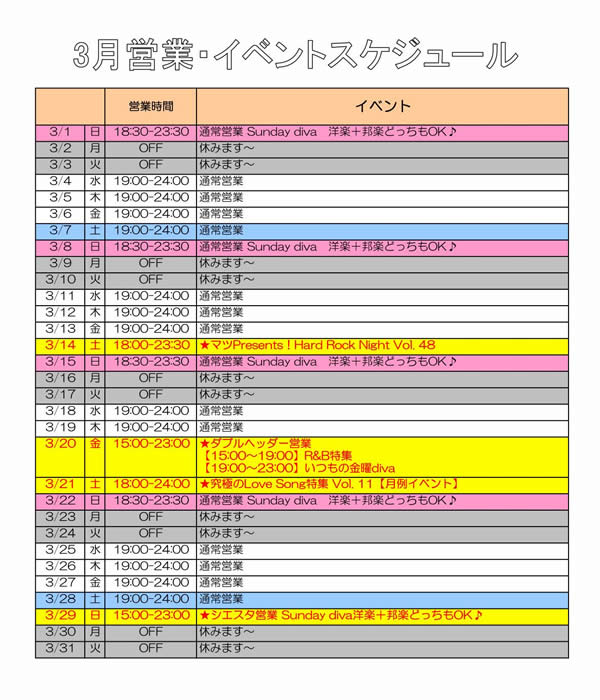 ★4/29(祝水)★ ダブルヘッダー営業 【15:00〜19:00】 昭和の日の昭和歌謡 日曜じゃないけどSunday diva洋楽+邦楽OK! ◎前半後半またいでのご参加OK ◎5時間超過の場合は+チャージ半額 ★5/2(土)★ ★4/18(土)★ アイドルを探せ!キャーキャーNight Vol. 13 【月例イベント】 ★5/16(土)★ Lyrics Night Vol. 16 【月例イベント】